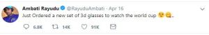 The Indian squad announcement was the first one to generate lots of news. The selection of Vijay Shankar over Ambati Rayudu and Dinesh Karthik over Rishabh Pant is being talked about even till now. While Rishabh Pant took the snub pretty well, Rayudu on the other hand wasn’t quite impressed with MSK Prasad’s “Three Dimensional” player comment. He did come out with a witty tweet as a response to that after the squad was announced. Rayudu’s frustration obviously was due to the fact that he isn’t getting any younger and this might be his last chance to play a world tournament.