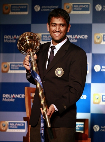 India's cricket captain Mahendra Singh Dhoni poses with International Cricket Council's (ICC) test championship mace